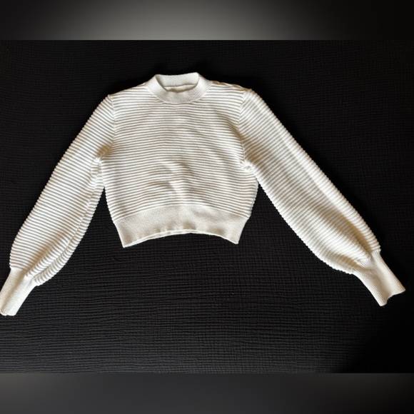 Stylish white ribbed knit sweater with long sleeves. Perfect for a cozy look.