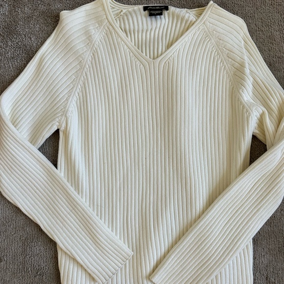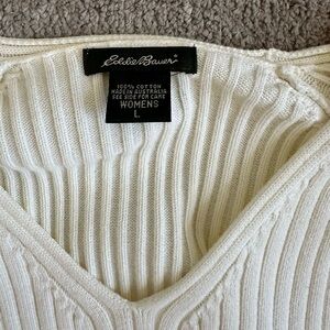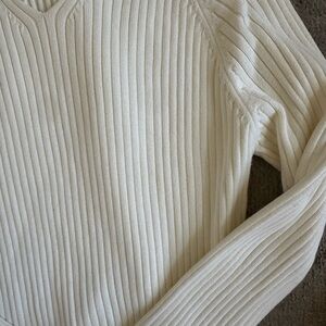 Stylish white ribbed sweater with a V-neck design. Perfect for any occasion.