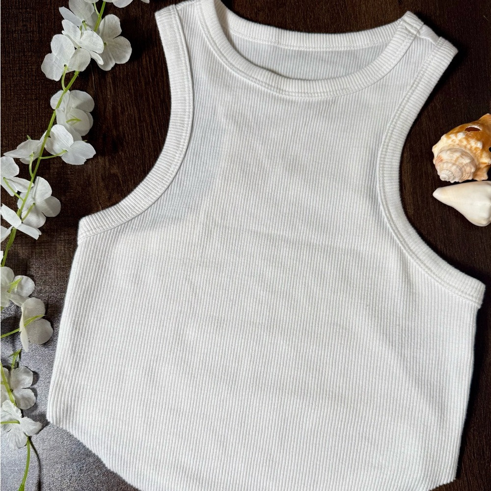 Elevate your wardrobe with this chic white ribbed tank top. Perfect for layering or wearing on its own, this versatile piece is a must-have for any fashion-forward individual.