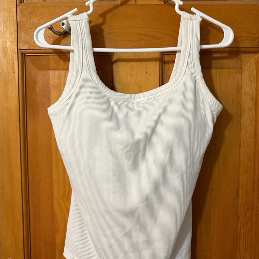 Elevate your casual wardrobe with this chic white padded ribbed tank top. Perfect for layering or wearing on its own, this versatile piece is a must-have for any fashion-forward woman. Please note the staining. Dog friendly home.