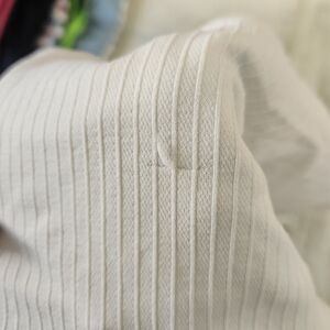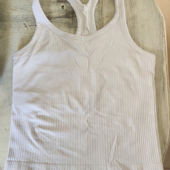 White ribbed tank top with built-in bra. Stretchy and soft. Has a run and some discoloration.