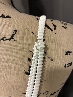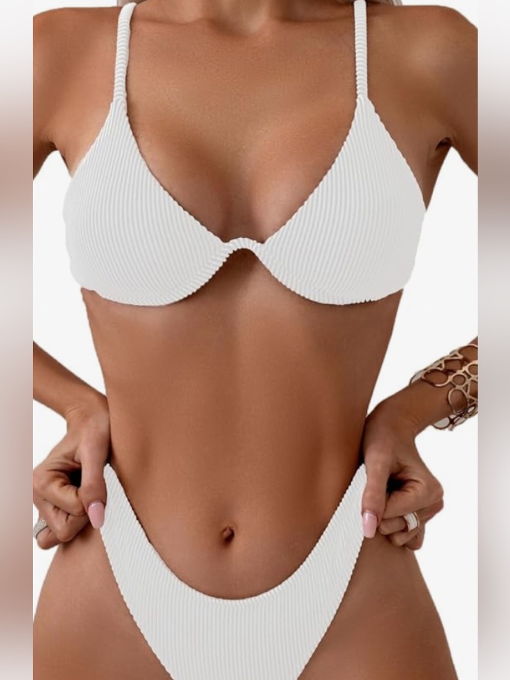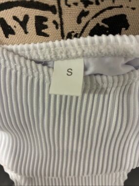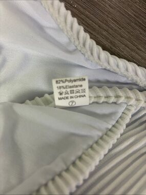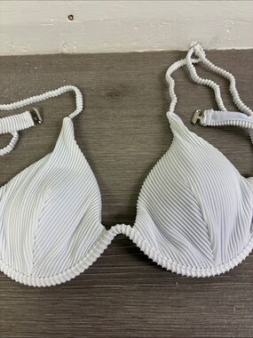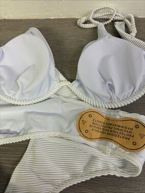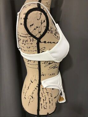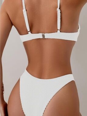 White ribbed two-piece bikini. Padded triangle top with adjustable straps. High-cut cheeky bikini bottoms with textured rib detail. Clean, minimalist beach style. Solid one piece underwire. Removable pads. NWOT Sanitary liner intact. PTP 14" waist 14", rise 9". No brand tag.