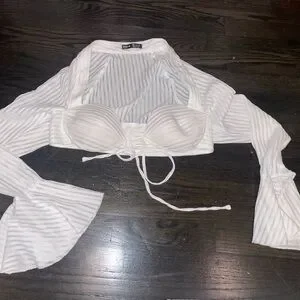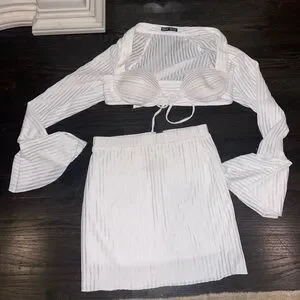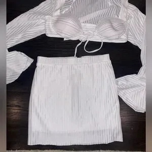 Stylish white ribbed two-piece set with flared sleeves. Perfect for a chic look.