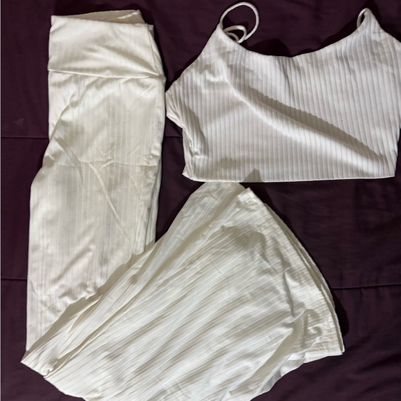 Stylish white ribbed two-piece set. Includes a crop top and matching pants.