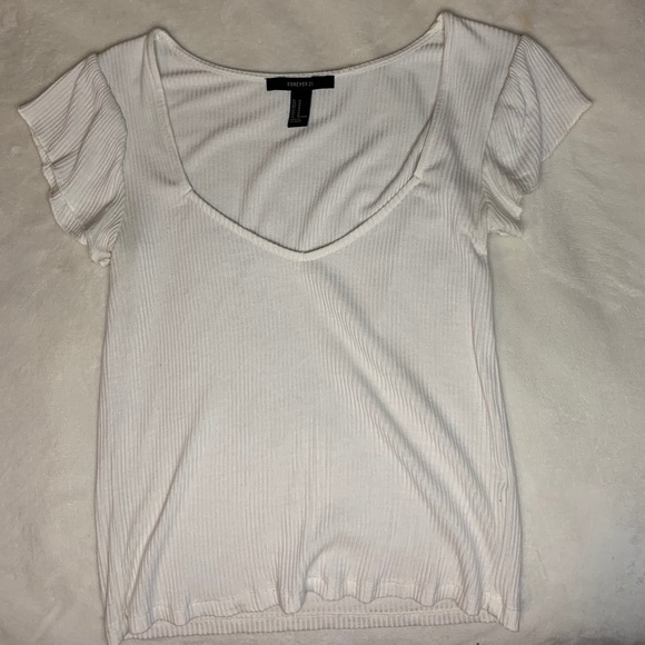 It is a white ribbed shirt. It has a flattering v neck with flowy shoulders. It is on the tighter and cropped side. It is very cute. Barely worn.