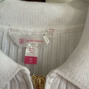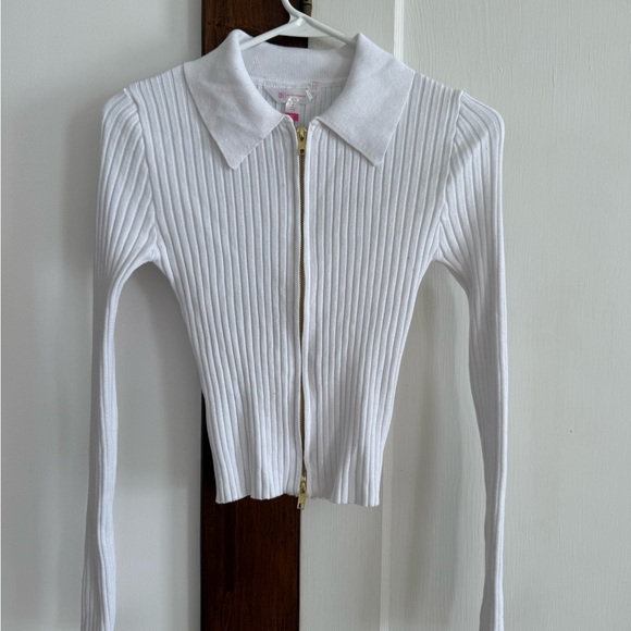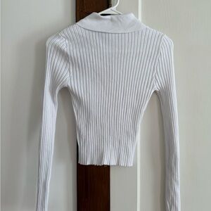 Stylish white ribbed sweater with a zip-up front. Features a classic collar and long sleeves, gold zipper.