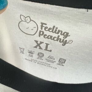 Soft white ringer tee featuring contrasting black trim and a cute panda-in-peach graphic. Comfortable, casual top perfect for everyday wear. Machine-friendly and easy to style with jeans or shorts.