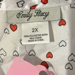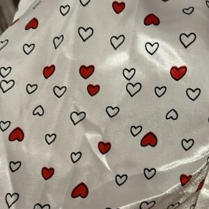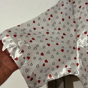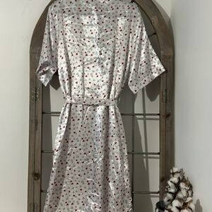Charming white robe adorned with a playful red heart pattern. Features a tie waist for a comfortable fit. It's very soft. Pit to pit 26", shoulder to hem 43".
