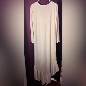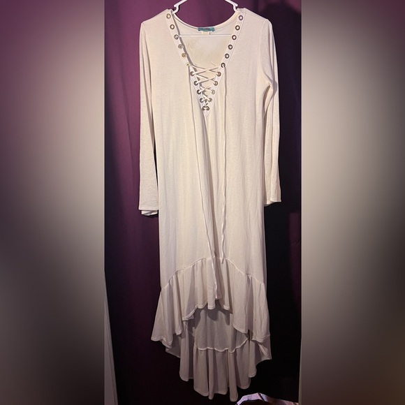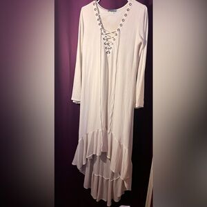 Very soft, lined white western dress. Flowy hi-low skirt brim, and bell style long sleeves. Made in the USA. Medal corset loops, minor snags in the lining. Looks amazing styled.