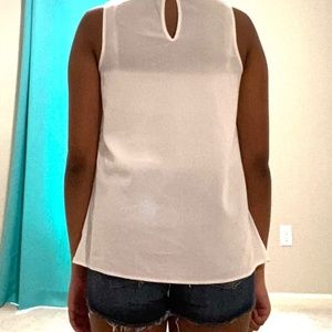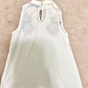 A white top with roses on both shoulders and a keyhole cutout in the front. Only worn once and no stains, scratches, scuffs, etc.