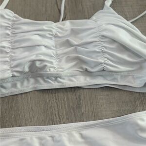 Elegant white bikini set featuring a ruched top and comfortable fit. Perfect for a stylish day at the beach.