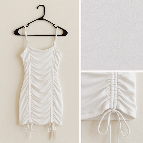 This white mini dress is perfect for any occasion. Featuring adjustable side drawstrings and double spaghetti straps, this dress is perfect for parties, nights out, or summer events. The stretchy fabric hugs your curves for a flattering silhouette, and the classic white color makes it easy to accessorize.