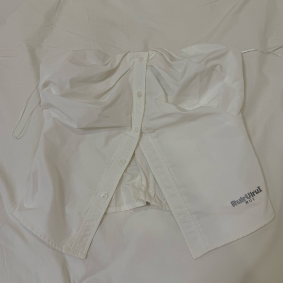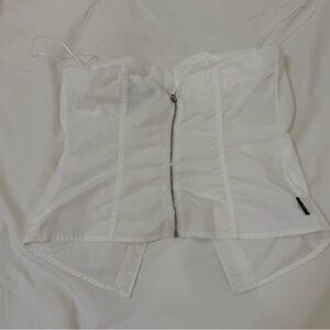 Stylish strapless white ruched button-up top. Perfect for casual outings.
