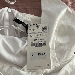 Brand new with tags but it arrived with a faint pinkish fabric dye stain that can easily be removed but I’m too lazy and it fits awkward on me so I don’t care enough to do it. I’m a 34D bust and typically wear XS/S and I’d say it’s true to size. I’m 5’2 and the length is just not short enough on me