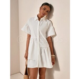 White Ruffle Asymmetrical Dress Short Sleeve Button Down