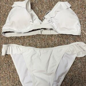 Elegant white bikini set with ruffle details. Perfect for a stylish beach day.