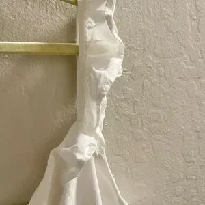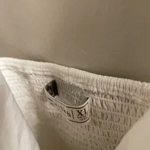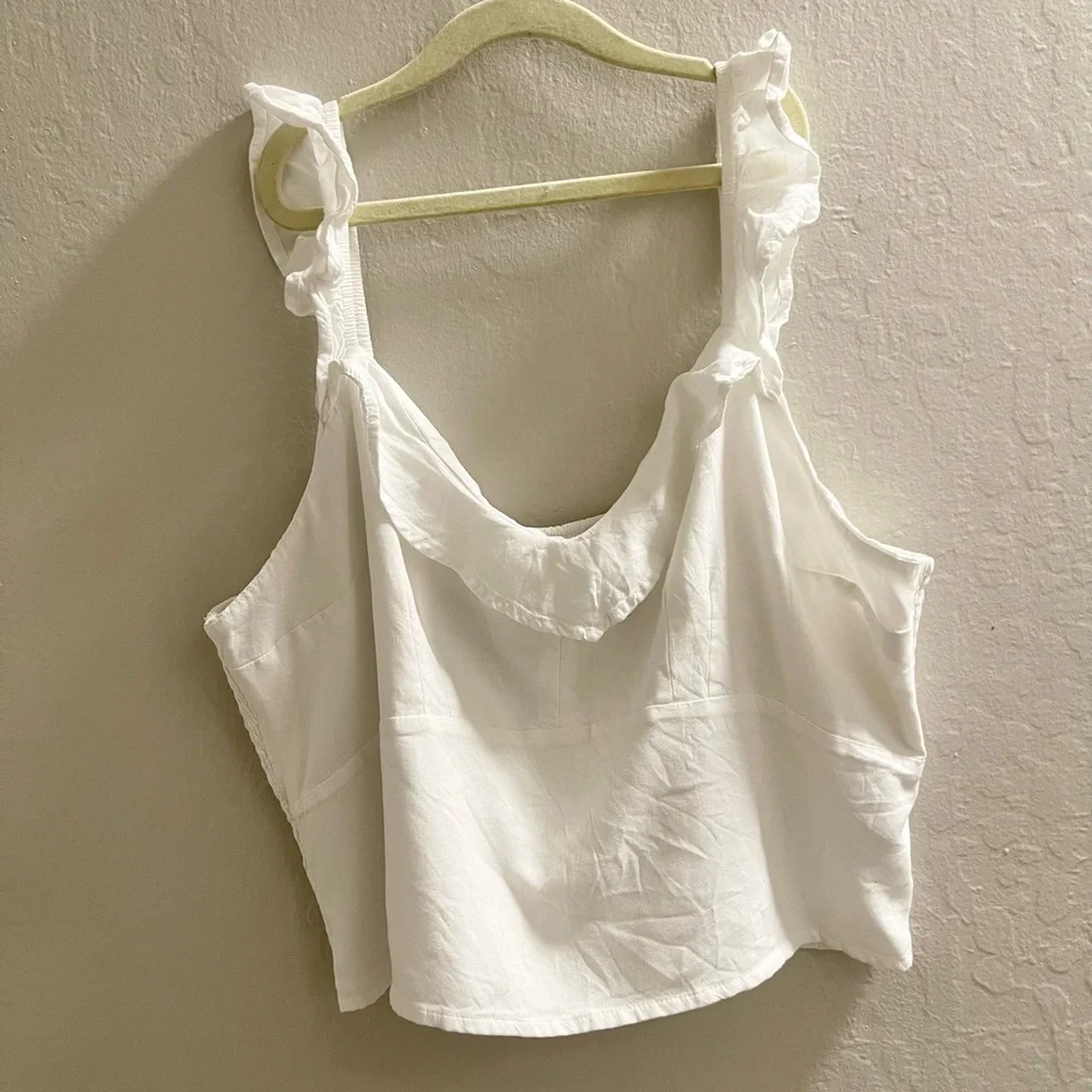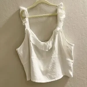 Chic white blouse with elegant ruffle straps. Ideal for versatile styling.