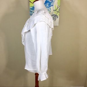 White ruffle top with long sleeves that gather at the end. A v neck and a v back. Women’s size small. No stains holes or flaws.