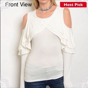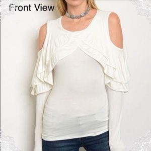 New with boutique tags. Solid White ruffle chest with trendy cold shoulder top.