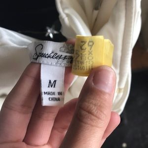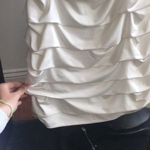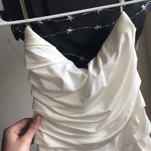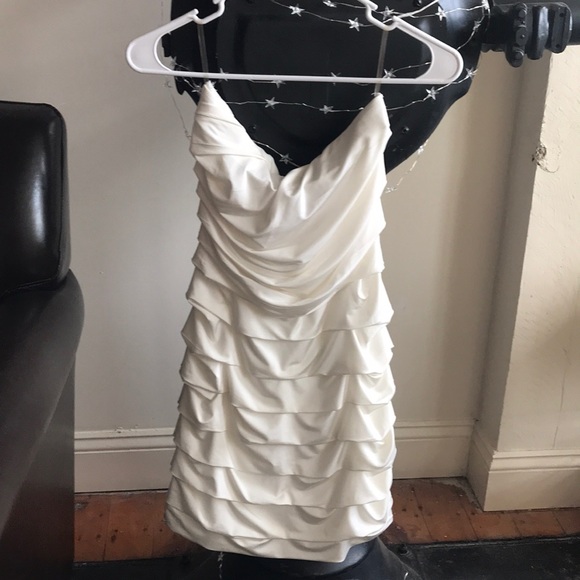 Very cute, silky type material white dress. Consistent ruffles down dress, strapless, zero stains, size medium!!