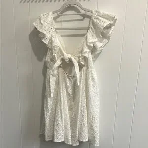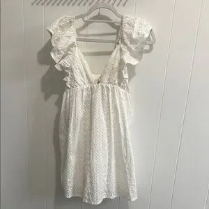 Charming white dress with eyelet details and ruffle sleeves. Perfect for a casual outing.