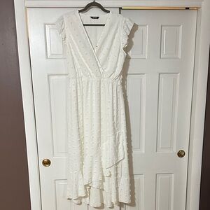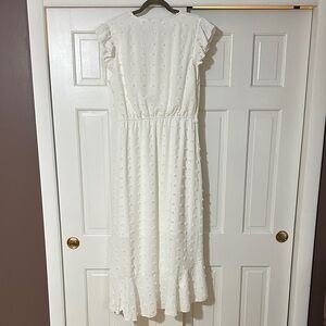 This elegant white dress features delicate ruffles and a flattering silhouette. Perfect for any occasion, it offers a timeless and sophisticated look.