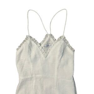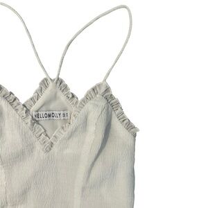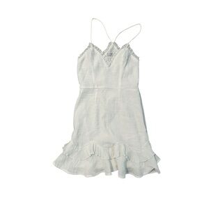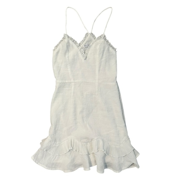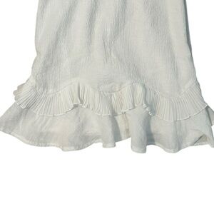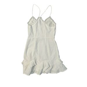 Chic white dress with ruffle details. Spaghetti straps. Lined so it is not see through.