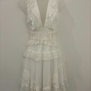 White tiered ruffle dress with deep V-neck and lace trim. Flowy silhouette with layered skirt, perfect for warm weather or special occasions.