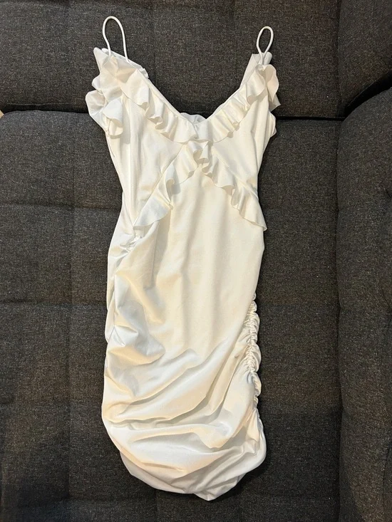 Elegant white dress with delicate ruffle trim and adjustable thin straps. Soft fabric drapes smoothly for a flattering silhouette. Side ruching adds texture and a modern touch. Perfect for special events or a polished evening look. Great condition!