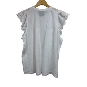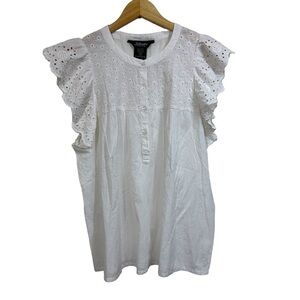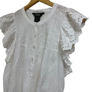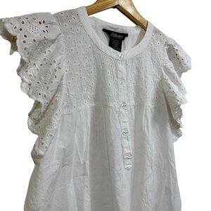 Delicate eyelet is etched across this 100% cotton top detailed with buttons and frilled with scalloped ruffles.This breezy blouse is crafted in eyelets with layered ruffle sleeves.