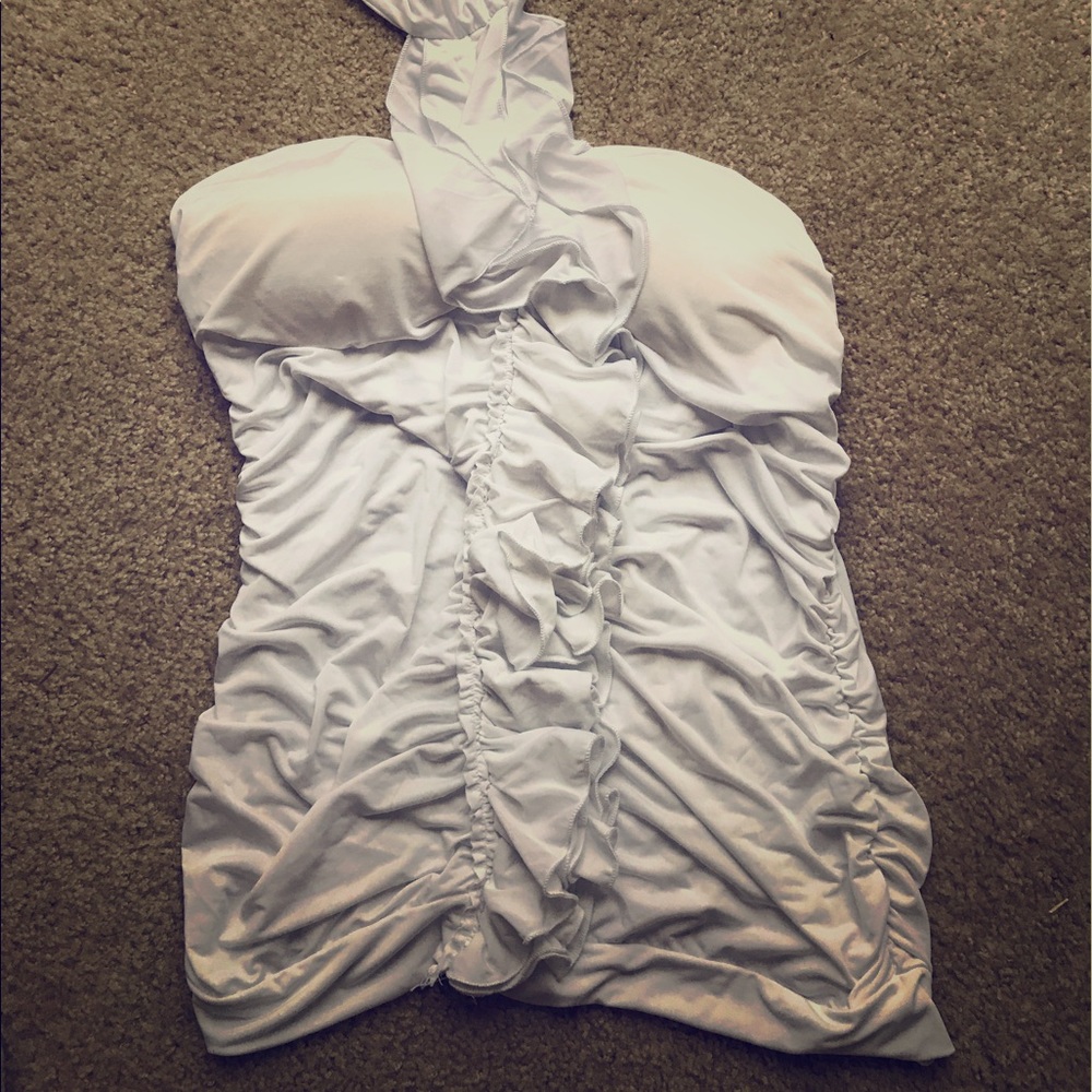 Very cute white ruffled halter top. Polyester and Spandex. Hand wash. Falls below the waist and fits around the hips.. Very cool and comfortable. Never worn but no tags.