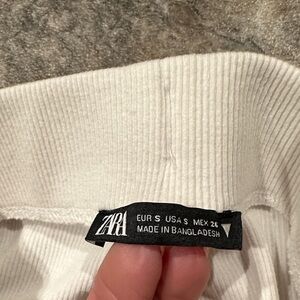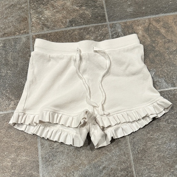 Soft white knit lounge shorts with elastic waist and drawstring. Double ruffle hem detail. Comfortable and casual design. Perfect for relaxing at home.