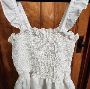 White ruffle mini dress, size medium. Soft, smooth material, slightly sheer. Needs to be steamed. No tags on dress, bought at a thrift store. Great condition, worn several times.