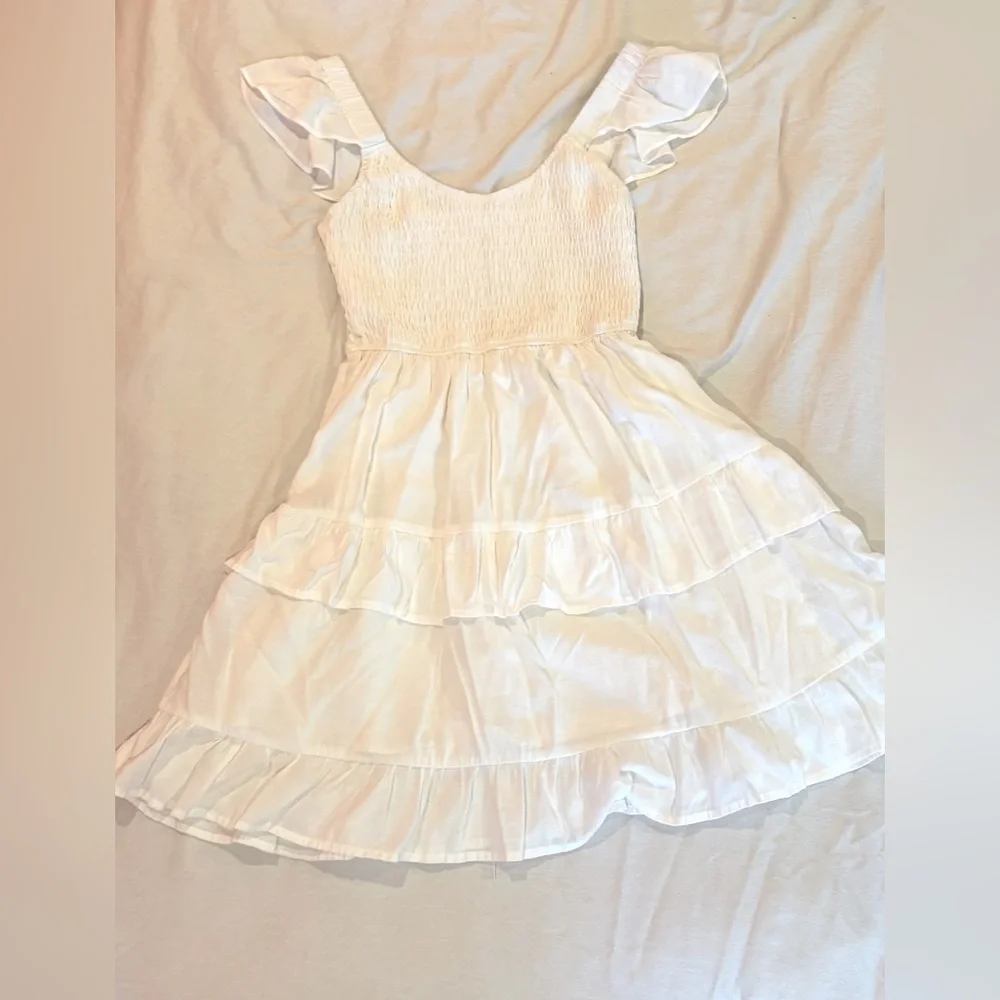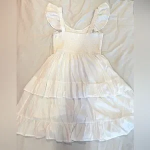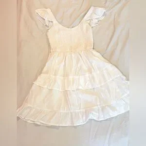 Classic white tiered dress with ruffle sleeves. Lightweight and breathable for warm days. Elastic smocked bodice ensures a comfortable fit. Stylish layered skirt adds playful movement. Versatile white dress perfect for casual wear and special occasions.