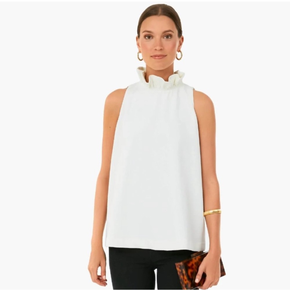 The perfect summer top that seamlessly transitions from work to going out. Top features a sleeveless design, with back tie blow, and has a relaxed fit. The ruffled detailing adds a touch of elegance, making it perfect for both professional and casual settings.