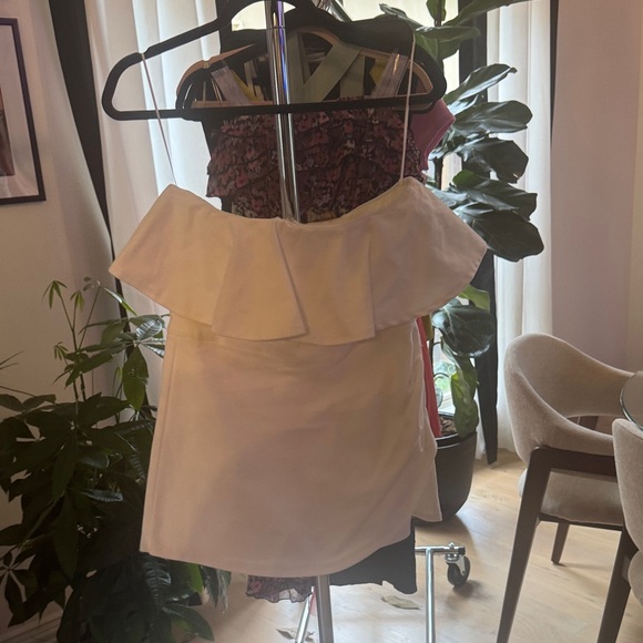 Chic white dress with ruffle off-shoulder design. Perfect for summer outings.
