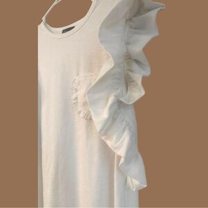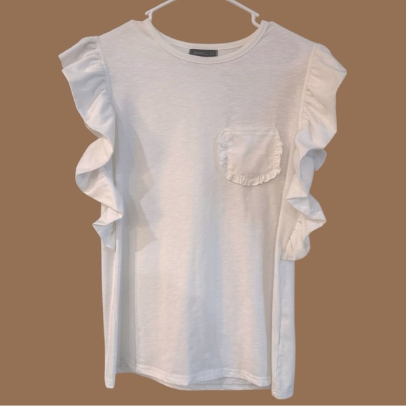 Stylish white top with ruffle sleeves and a front pocket.