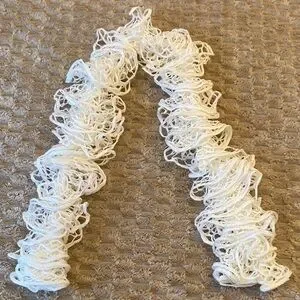 Lightweight ruffle scarf with open knit texture. Soft and airy feel. Versatile accessory for layering. Bright white color pairs with any outfit.