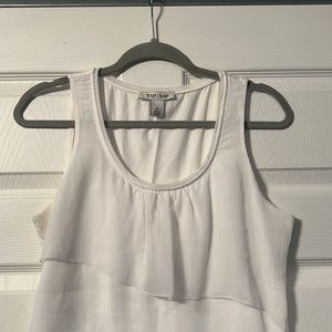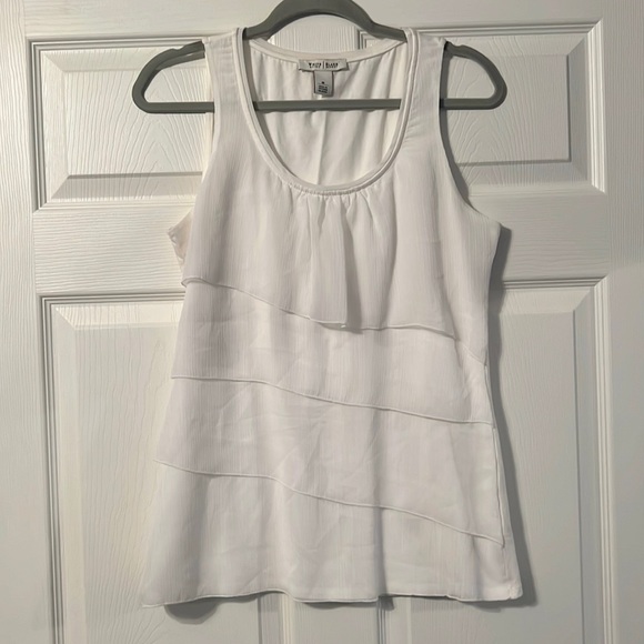 Size medium white ruffle tank from White Hosue Black Market. 4 Tired ruffle in the front. Back is just plain.
