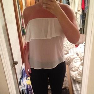 Never worn and in wonderful condition. White sheer tube top with ruffle detail on top. Perfect for summer festivals! This is such an easy top to just throw on and go. It's really pretty and light. :)
