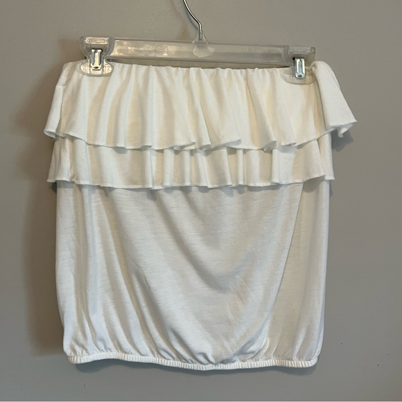 White ruffle tube top from American Eagle. Has built in elastic “bra” band. Not padded. Elastic top and bottom hems. Very soft and comfy. About 16.5” from top to bottom. Looks cute with high waisted shorts!