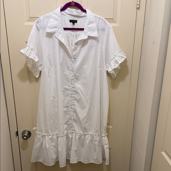 Lightweight white mini dress with feminine ruffle trim. Button-front styling and a relaxed fit for easy wear. Short ruffle sleeves and a tiered hem add playful movement. Versatile white color for day-to-night looks.