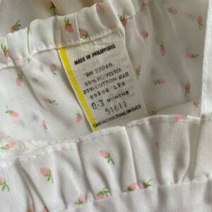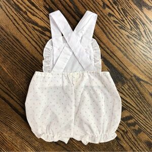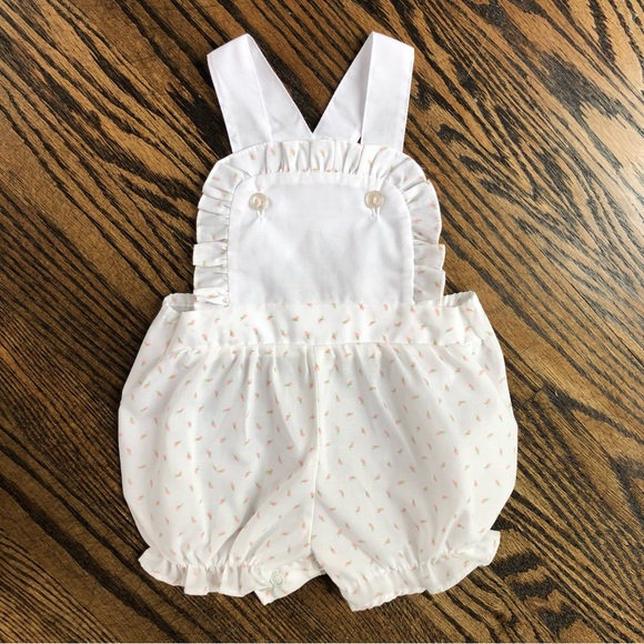 Adorable white vintage baby romper with ruffled straps. Features subtle colorful patterns.