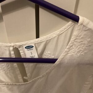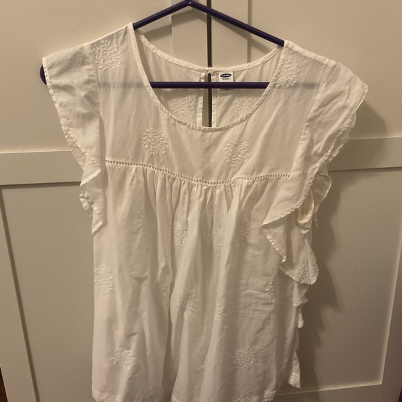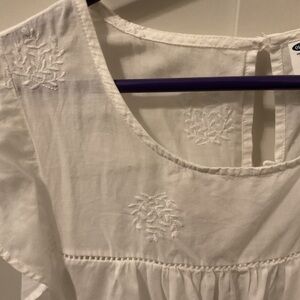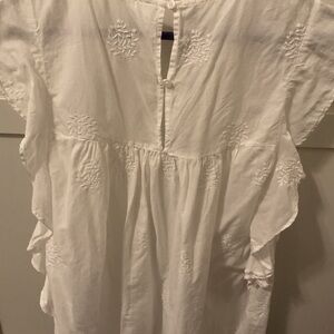 White blouse with ruffled sleeves and some embroidery, very cute and classy! Total beach vibes!