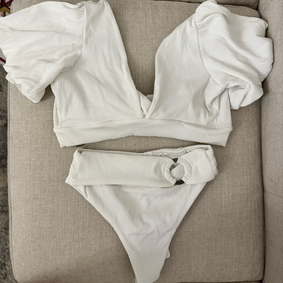 Elegant white bikini set featuring a stylish ruffled top and high-waisted bottoms. Perfect for a chic beach look.