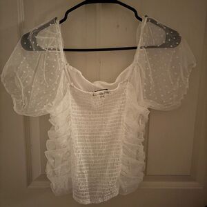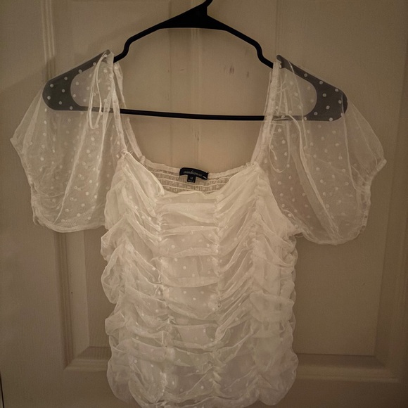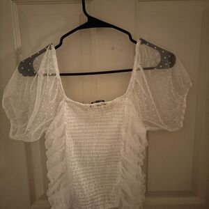 Chic white blouse with ruffled front. Sheer puff sleeves add elegance. Perfect for versatile styling.