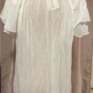 NWT Elegant sheer white blouse with ruffled details and tie neckline.