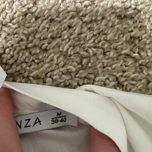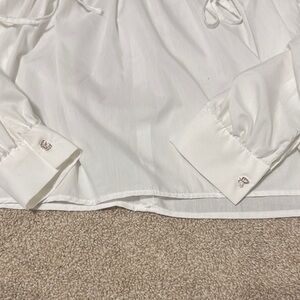 Chic white blouse with ruffle details. Long sleeves and gathered front. Perfect for elegant occasions.