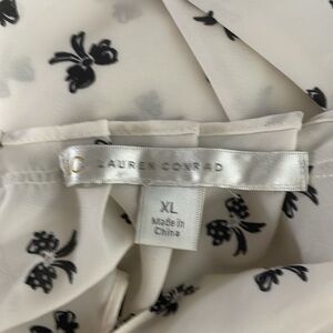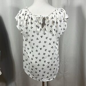 This elegant white blouse features a charming black ribbon pattern, adding a touch of whimsy to its relaxed style. The ruffled neckline and short flutter sleeves enhance its feminine appeal, while the flowing fit ensures comfort throughout the day.