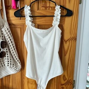Chic and stylish white bodysuit with ruffled straps, perfect for any occasion. Pair it with your favorite jeans or skirt for a fashionable look.